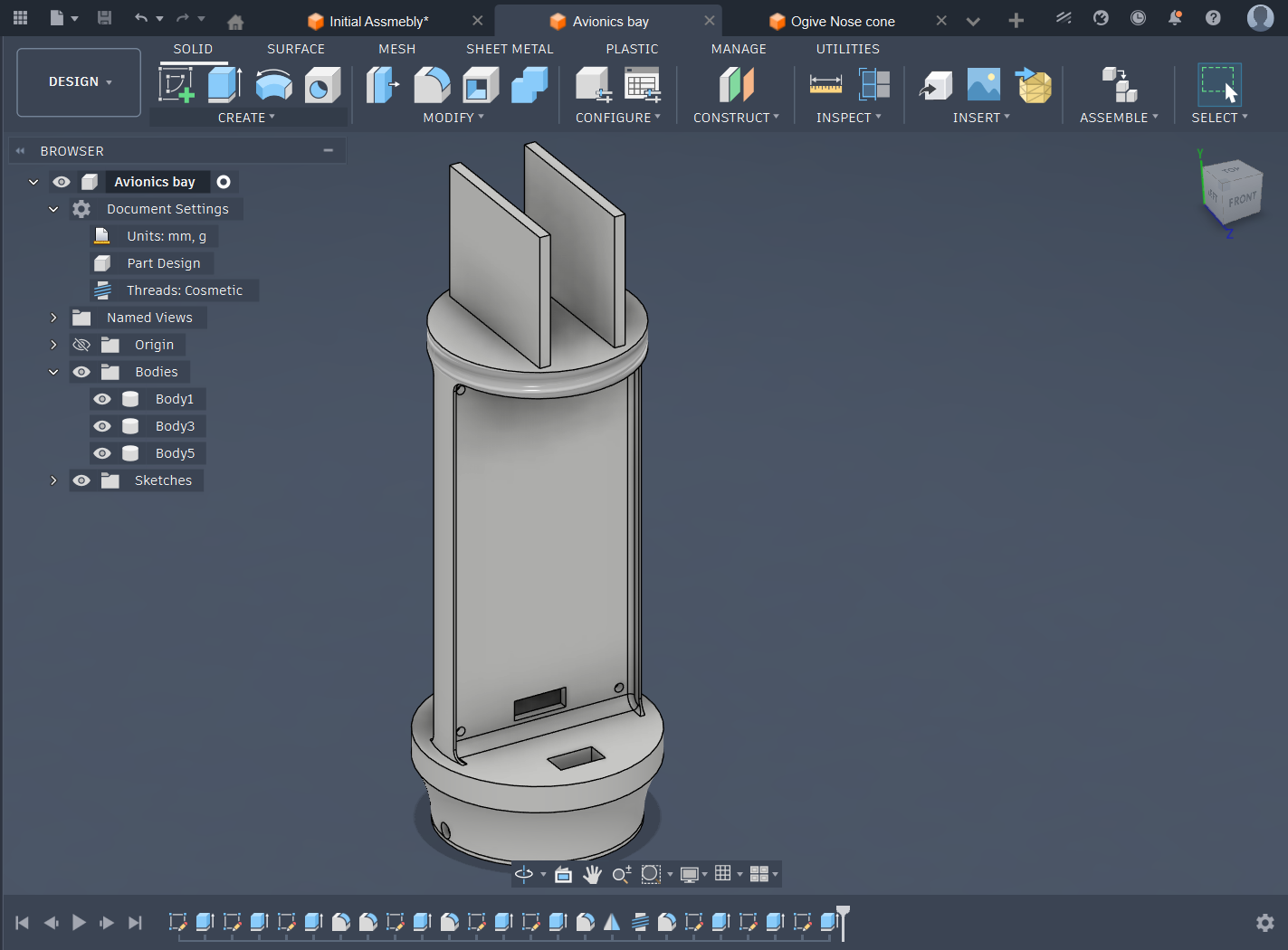 Owned all structural design end-to-end: iterated rocket geometry in OpenRocket and Fusion 360, optimising off-rod velocity and stability margin; redesigned nosecone shoulder geometry to integrate a custom avionics bay.